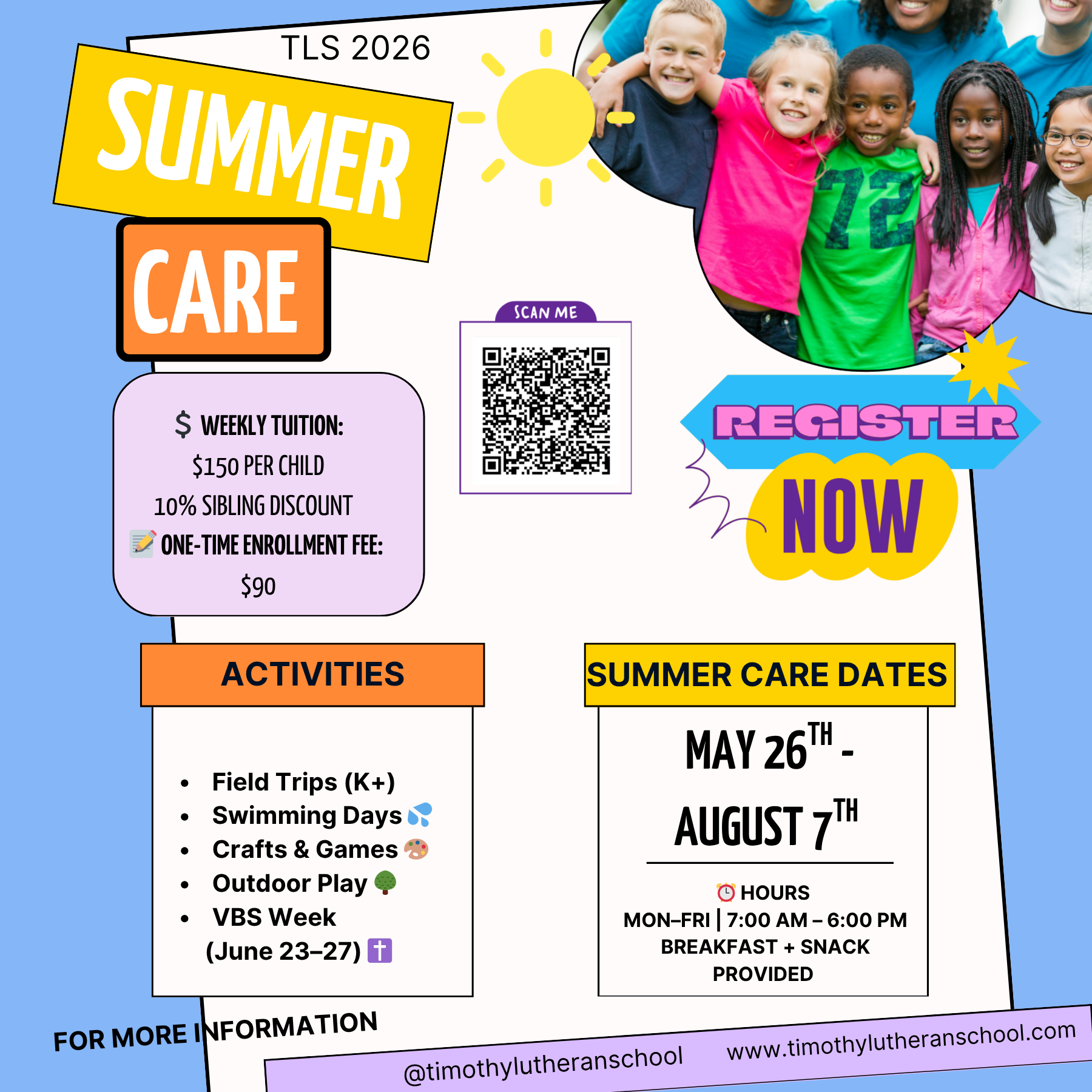 It is time to enroll for Timothy Lutheran School Summer Care. Please click the link to sign up. If you have any questions please contact Clancy in the office. 816-228-5300 ext. 8017.